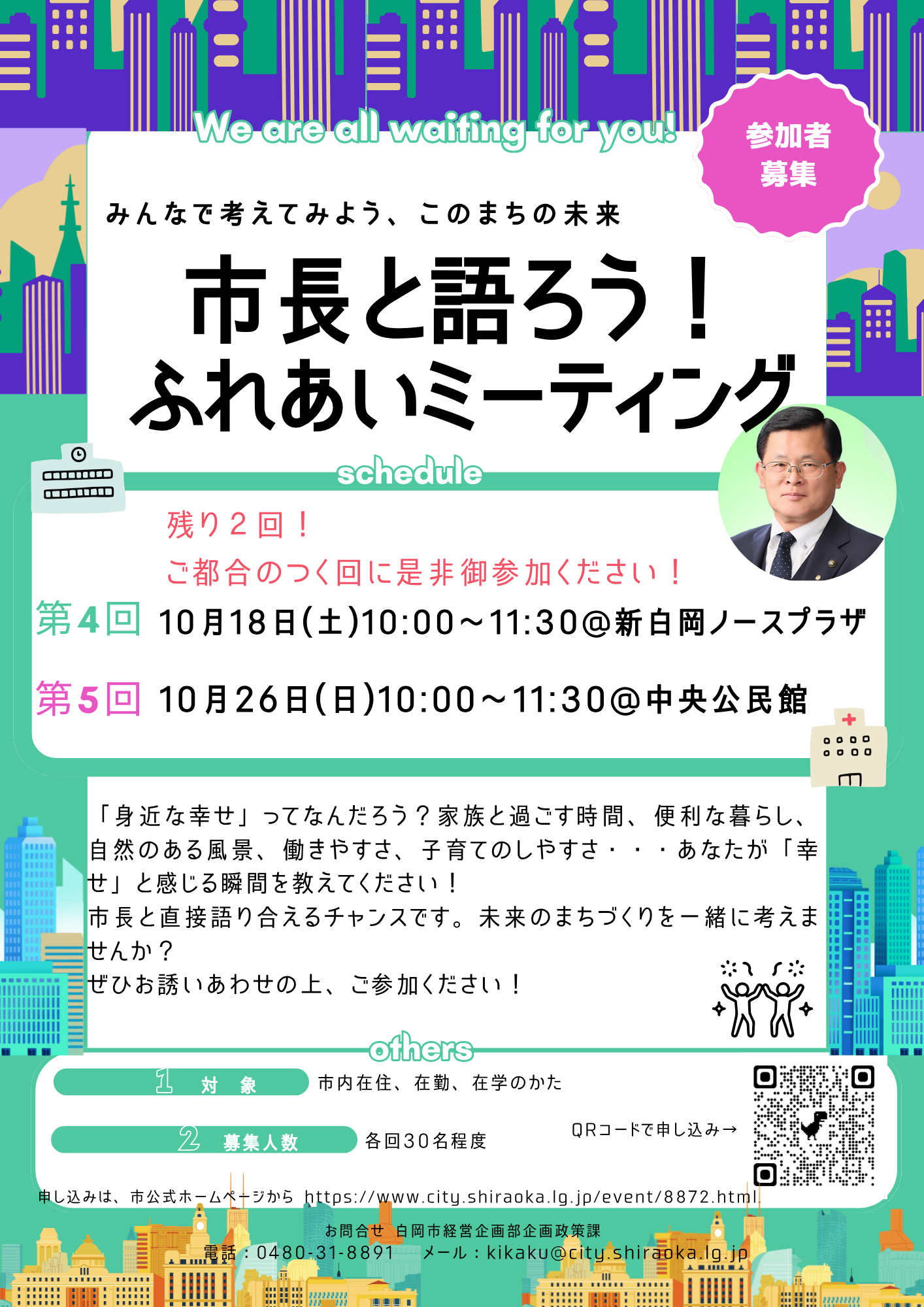 第6次白岡市総合振興計画後期基本計画の策定に当たり、市民の皆さまの声を計画に反映させるため、市民の皆さまが市長と直接語り合う「市長と白岡の未来を語ろう『ふれあいミーティング』」を開催します。皆さまとの率直な意見交換を通じて、多様な視点を取り入れた計画策定を目指します。