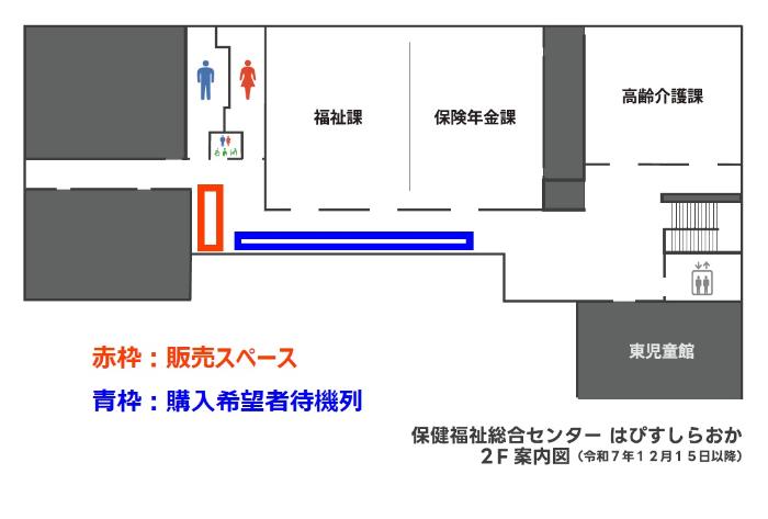 現在、はぴすしらおか1階が衆議院議員選挙の期日前投票所となっていることから、今回の販売は場所をはぴすしらおか2階に変更いたします。