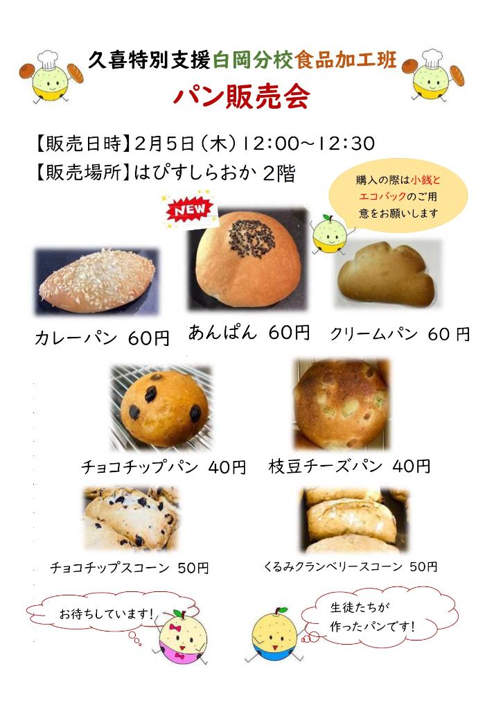 2月5日(木曜日)正午から12時半まで、久喜特別支援学校白岡分校食品加工班の生徒の皆さんによる販売を行います。
