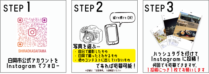 - Instagramから応募したかた…白岡市公式Instagramアカウントからダイレクトメッセ ージ(DM)をお送りします。