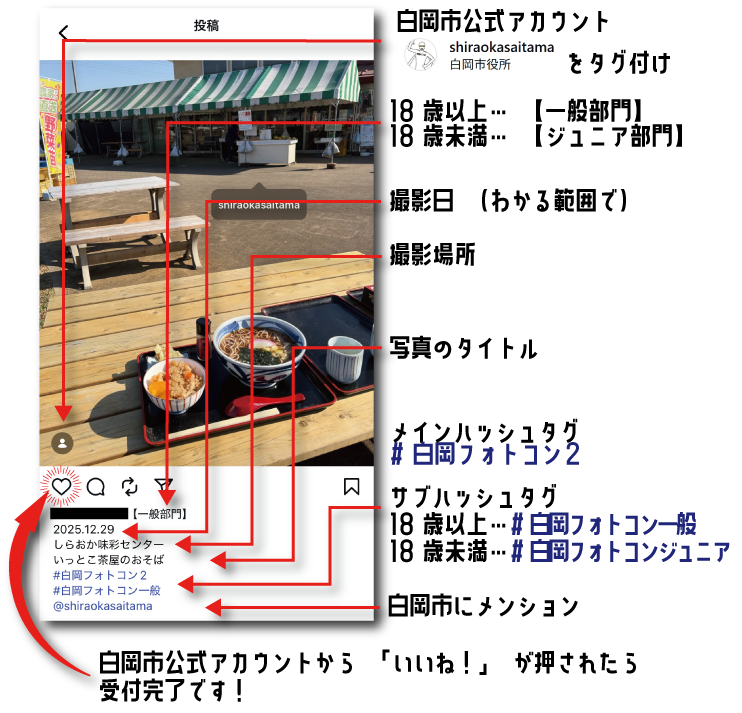 - 広報しらおか、市公式ホームページ、白岡市公式SNS等で作品を紹介する際に、撮影者の氏名(又はペンネーム)、住所(市区町村名まで)等を掲載する場合があります。