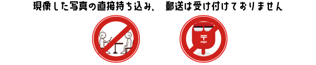 - 現像した写真の直接持ち込み・郵送は受け付けておりません。送付されてもご連絡や返却等は行いませんのでご了承ください。
