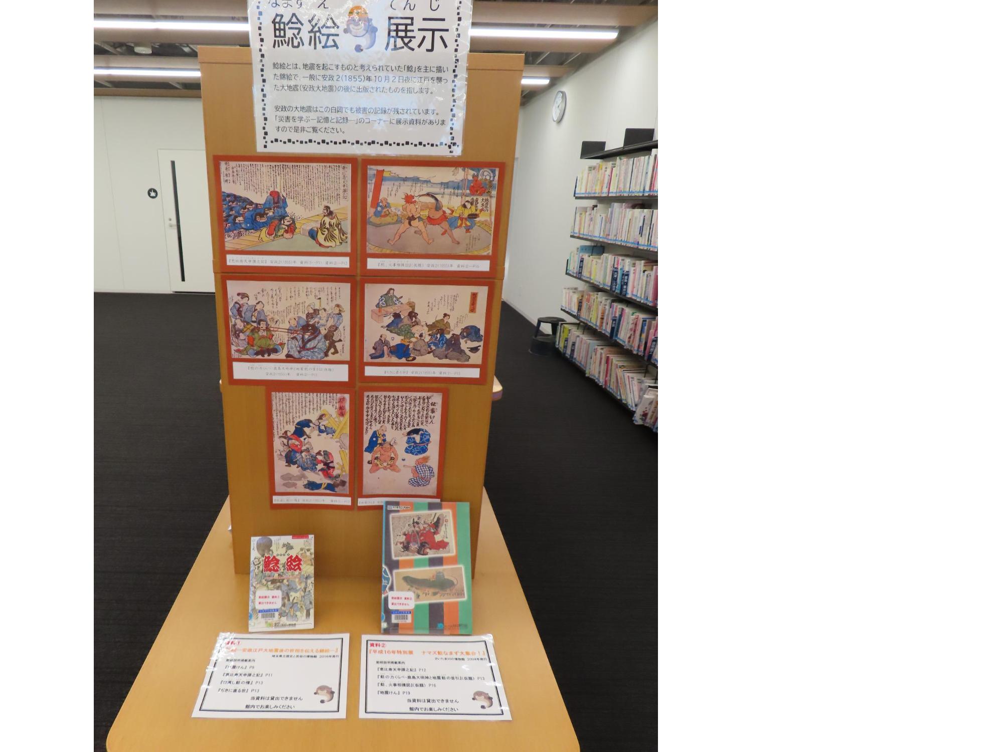 あわせて、鯰絵(なまずえ)の展示も行っています。昔の日本では、地震が起こるのは「なまずが暴れるから」と考えられていました。江戸時代に人気を博したユーモアと風刺に富んだ鯰絵と、解説資料を展示していますので、ぜひご覧ください。