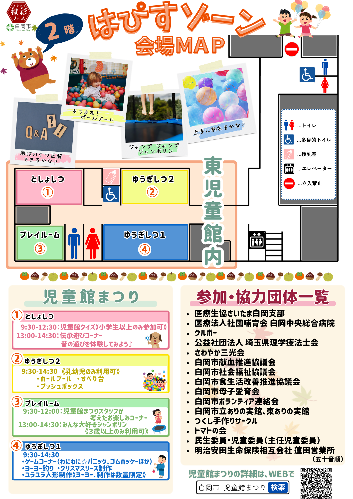 しらおか秋の彩りフェスタと共催の、児童館祭のポスターです。クリスマスリースやお人形の制作体験など、面白そうなイベントが目白押しです。